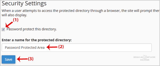 5. Under Security Settings, check the box next to the Password protect this directory and enter a name for the protected directory like Password Protected Area. Then click the Save button.