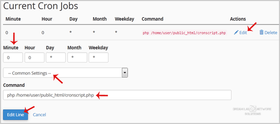 3. Scroll down to the end of the page, and under Current Cron Jobs, locate your cronjob and click on the Edit button.