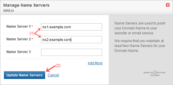 5. Enter the nameservers found in our Welcome Email and click on the Update Name Servers button.