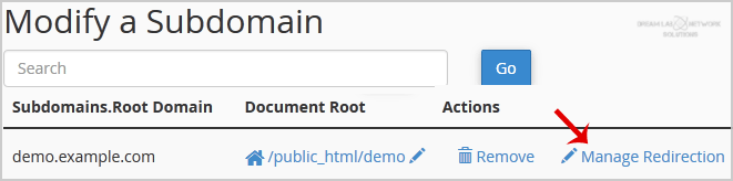 4. Click the Manage Redirection link that corresponds to the subdomain that you wish to manage.